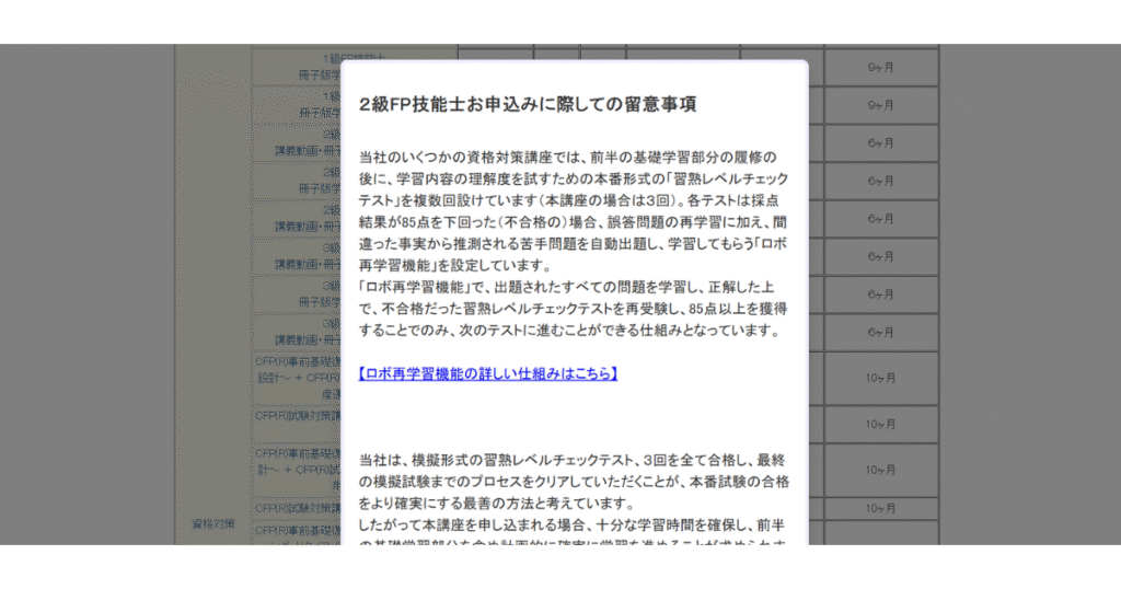 「2級FP技能士講座」にチェックを入れると、画面に「2級FP技能士お申込みに際しての留意事項」が表示されます。