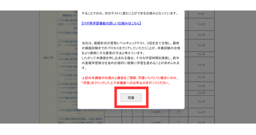 内容をスクロールしながら確認し、問題なければ「同意」ボタンをクリックして進みます。