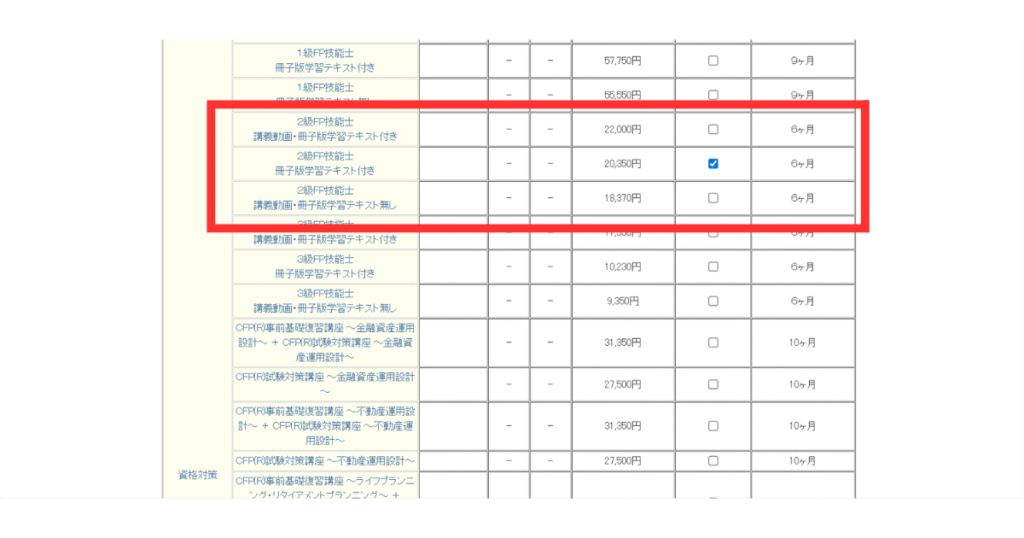 そのなかから受講したい「2級FP技能士講座」 のチェックボックスにチェックを入れましょう。