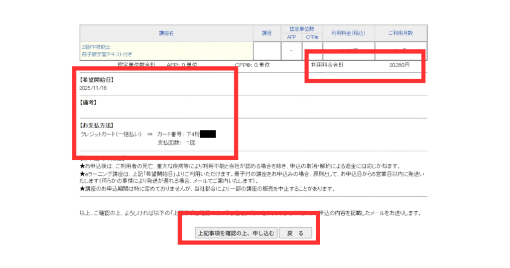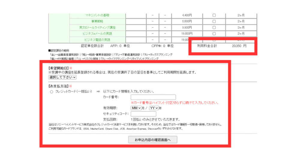 申込内容の確認画面にある通り、申し込み確定後の取消や解約はできません。氏名・住所・希望開始日・講座選択に誤りがないか、送信前に慎重に確認しましょう。
