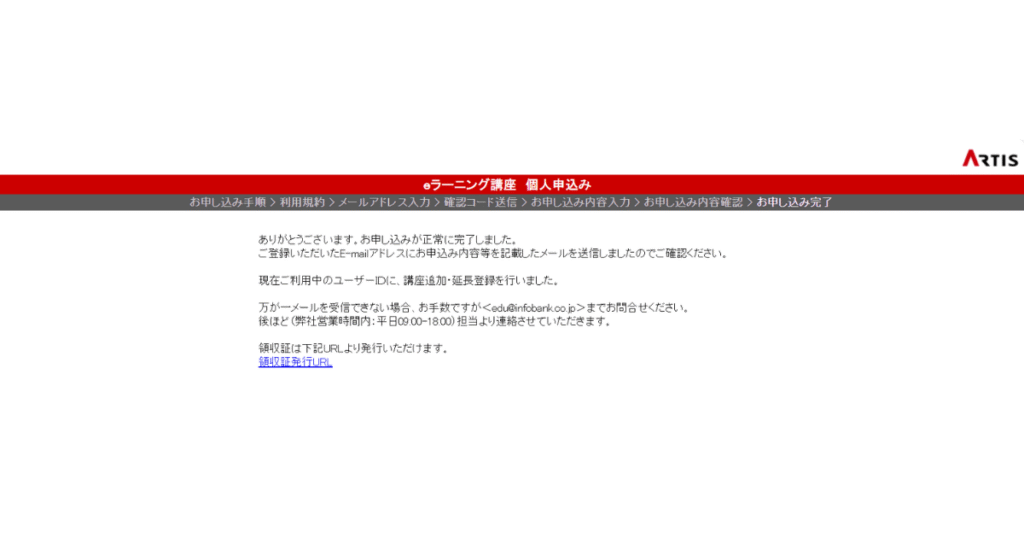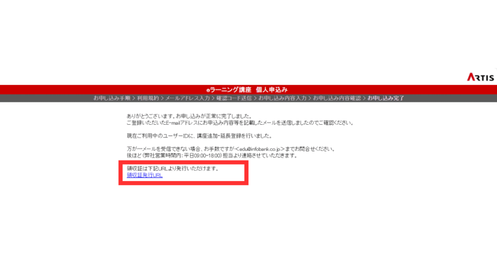 紙の領収証が必要な場合は「お申し込み完了」画面から領収証発行ページに進むことができます。