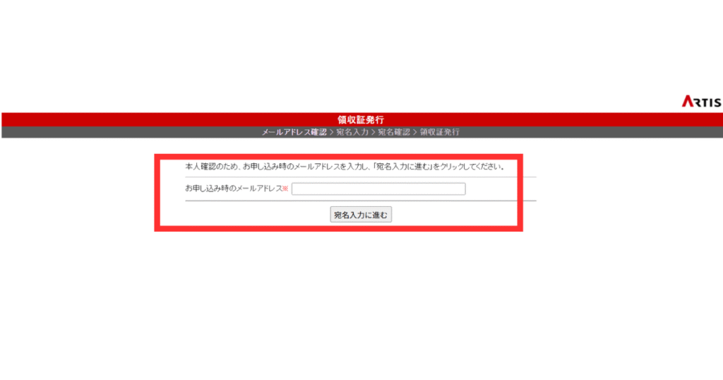 本人確認として、申込時に使用したメールアドレスを入力し「宛名入力に進む」をクリックします。