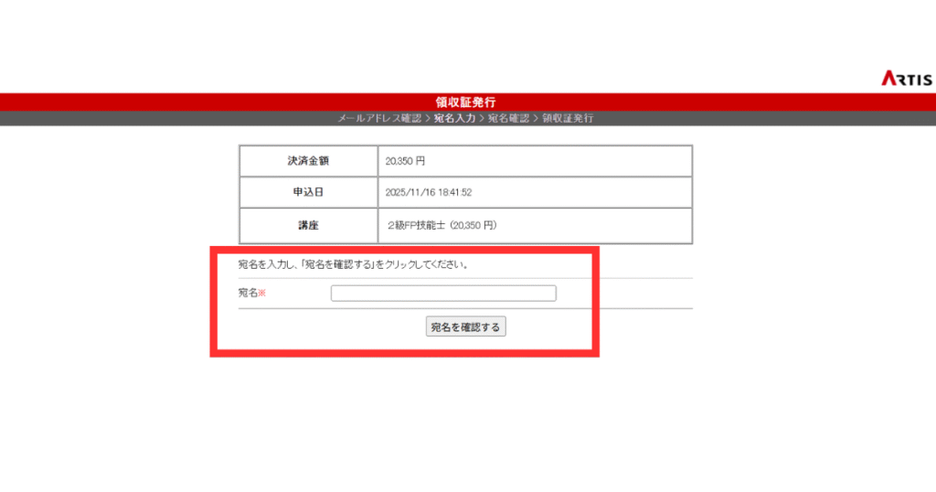 領収証に記載する「宛名」を入力し「宛名を確認する」をクリックします。