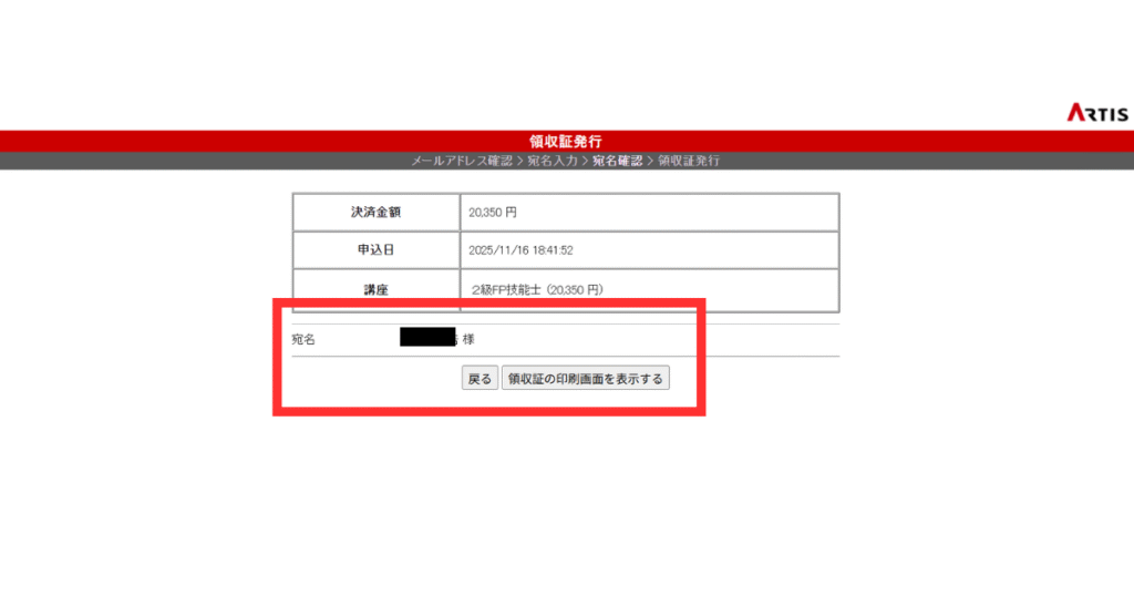 内容を確かめたら「領収証の印刷画面を表示する」をクリックします。