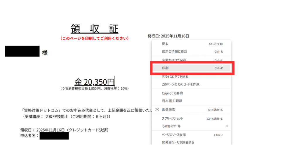 表示された領収証画面を右クリックして印刷画面に進み、プリントアウトします。必要に応じて、印刷した領収証を保管しておきましょう。