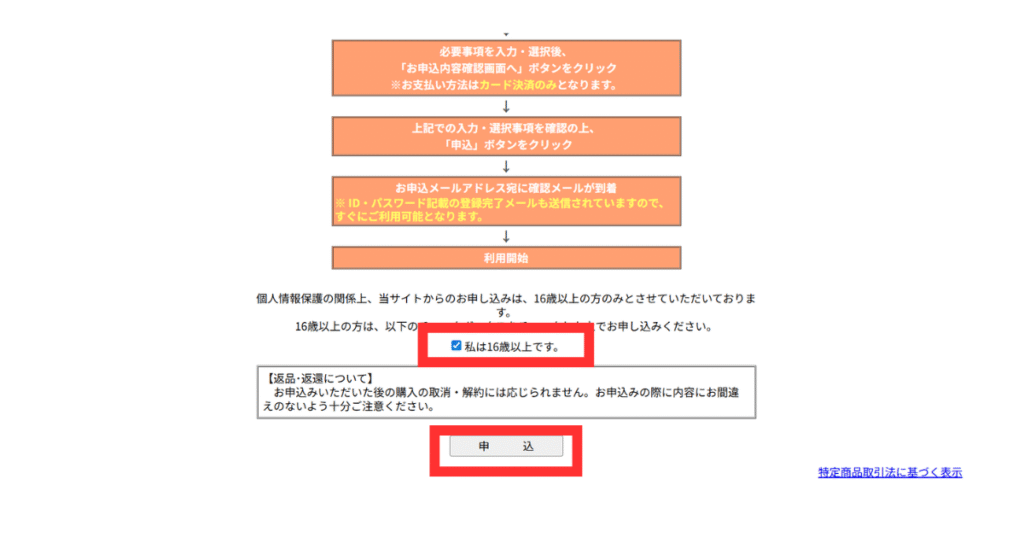 画面を下へスクロールすると 「私は16歳です。」 というチェックボックスが出てくるので、内容を確認したうえでチェックを入れ「申込」ボタンをクリックします。