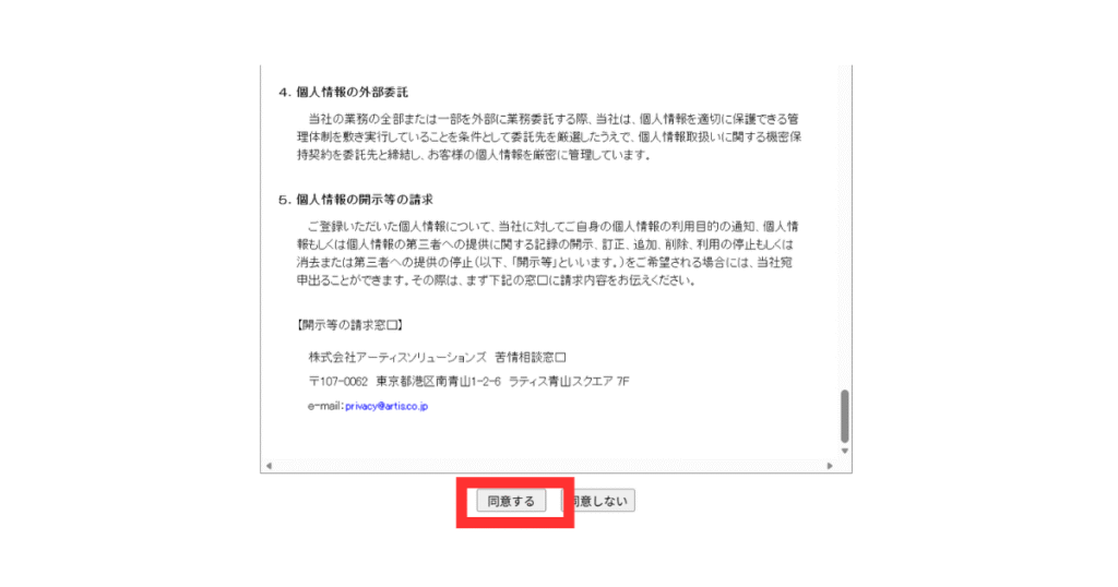 各内容をスクロールしながら確認し、問題なければ「同意する」ボタンをクリックして次へ進みましょう。