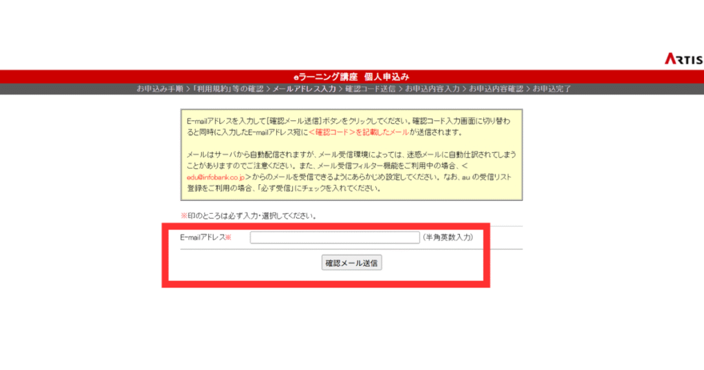 本サイトでのお申込みにあたって当社から配信されるメールは、サーバから自動配信されますが、メール受信環境によっては、迷惑メールに自動仕訳されてしまうことがありますのでご注意ください。また、メール受信フィルタ機能をご利用中の場合、〈edu@infobank.co.jp〉からのメールを受信できるようにあらかじめ設定してください。なお、au の受信リスト登録をご利用の場合、「必ず受信」にチェックを入れてください。