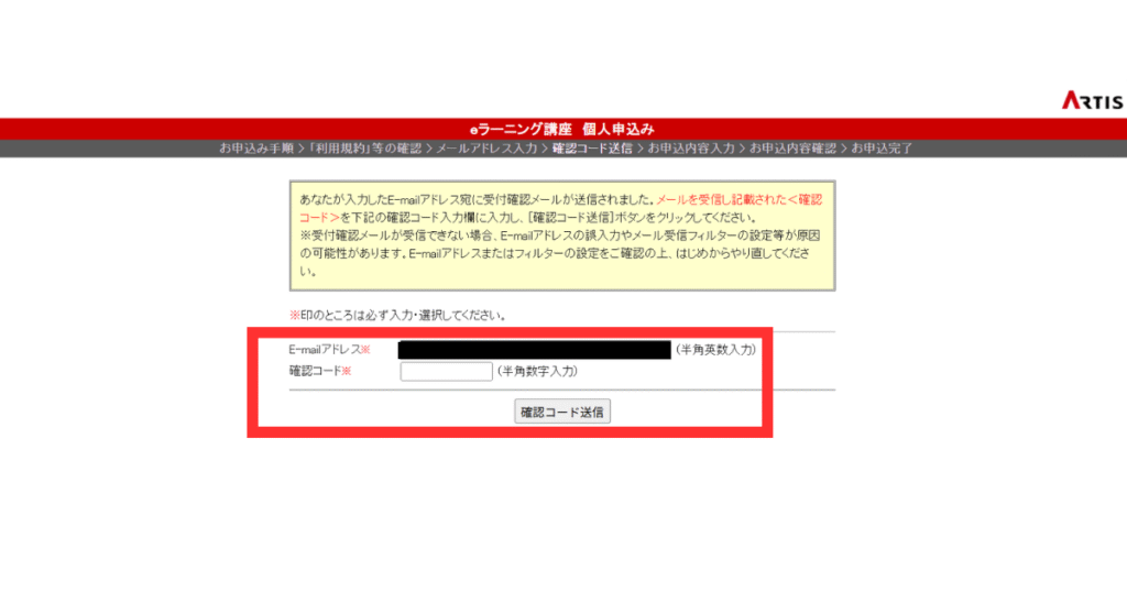 メールを確認し、記載されている確認コードを入力したら、「確認コード送信」 ボタンをクリックして次のステップへ進みましょう。